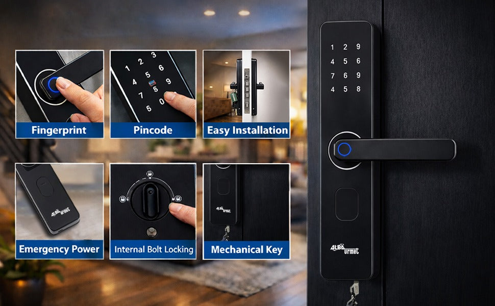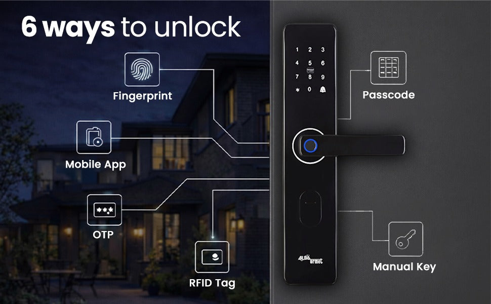- 6-Way Smart Unlocking - Unlock your door via Fingerprint, PIN Code, RFID Card, Mechanical Key , OTP & APP. Experience effortless access with multiple secure unlocking modes. Supports 13.56MHz RFID cards, 100 fingerprints, 100 user codes, OTP sharing, and key backup—ideal for family, guests, and office use.