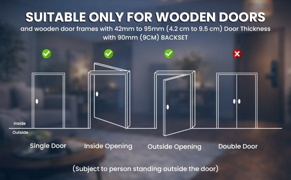 - Wide Compatibility - Works on 42–95 mm Door Thickness & All Weather Conditions. Designed for Indian homes and offices, the lock operates seamlessly from –25°C to +55°C, ensuring reliable performance in all climates. Compatible with most residential and commercial flush wooden single leaf doors.